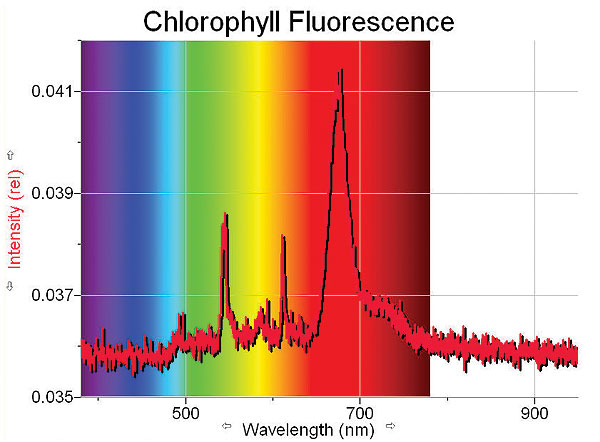 One final test was done with the chlorophyll solution. Chlorophyll is fluorescent, and we wanted to see if the Vernier Spectrometer could detect it. To test fluorescence, which is light emission rather than absorbance, we removed the light source/cuvette holder from the spectrometer. Then we poured about 2 mL of the chlorophyll solution into a plastic cuvette with four clear sides. We sealed the cuvette with a plastic cap and placed it directly in front of the opening in the spectrometer. By positioning a pen light (also purchased at the grocery store) at a 90° angle to the spectrometer opening, we could not only see the faint orange-red glow of the fluorescing chlorophyll in the cuvette, but the Spectrometer detected it as well. The graph is shown here to the right.