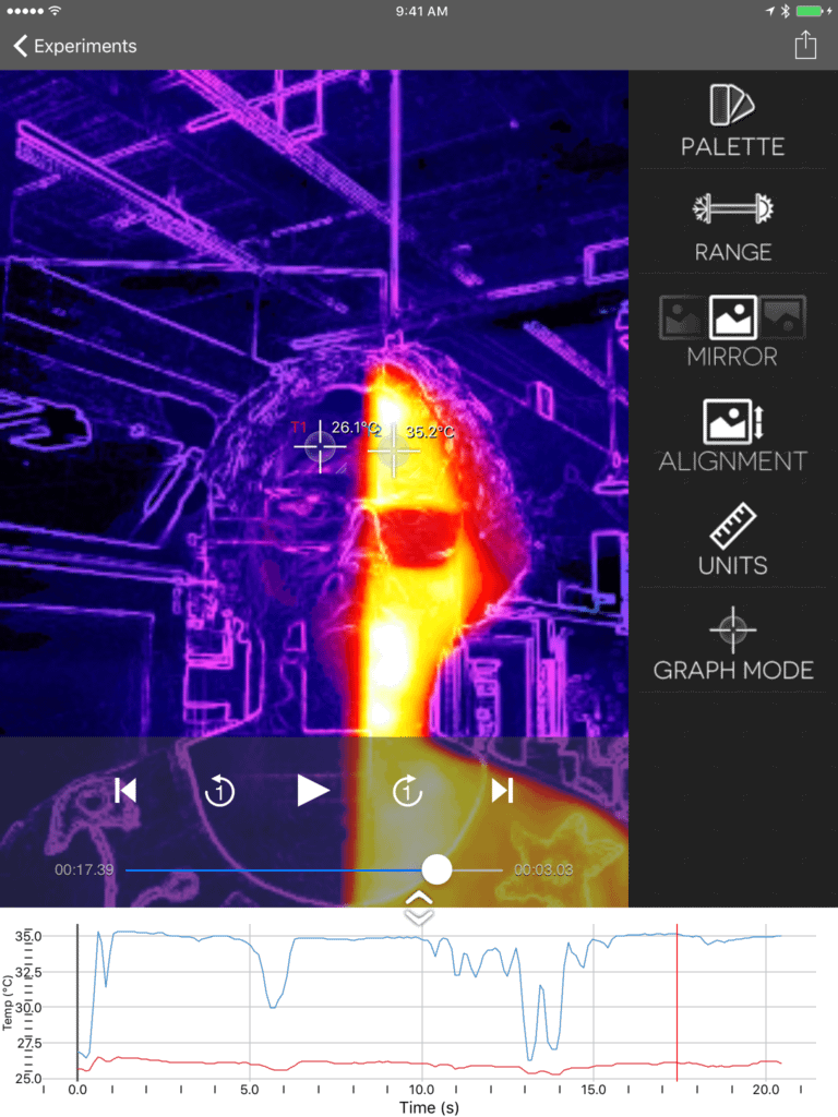 Similarly, you can investigate reflection. Look at your thermal reflection in a variety of surfaces, such as smooth glass, cinderblock walls, book covers, the surface of water in a bowl, a mirror, and other surfaces you can find.